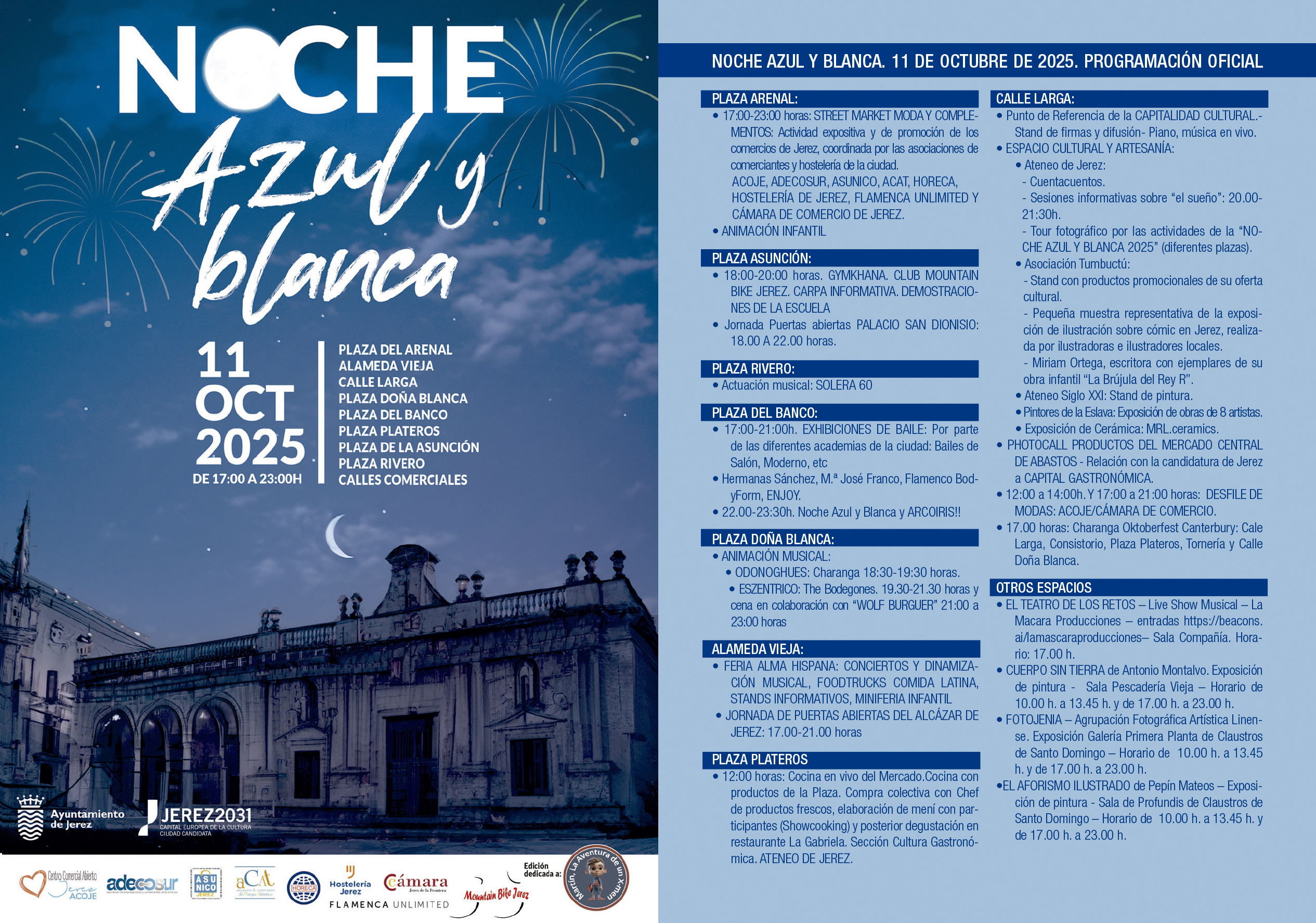 La ‘Noche Azul y Blanca’, impulsada por el Ayuntamiento de Jerez, a través de la Delegación de Comercio y Consumo, ofrecerá la tarde-noche de este sábado, 11 de octubre, una amplia oferta comercial y cultural destinada a dar visibilidad al tejido empresarial local, al sector servicios y a la industria de la cultura.