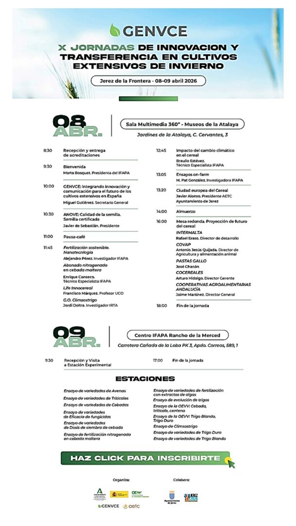 Las X Jornadas GENVCE de Innovación y Transferencia en Cultivos Extensivos de Invierno se celebrarán los días 8 y 9 de abril de 2026 para consolidarse como uno de los principales encuentros del sector cerealista en España. El evento reunirá a investigadores, técnicos, empresas y profesionales agrícolas en torno a los últimos avances en innovación varietal y manejo de cultivos extensivos
