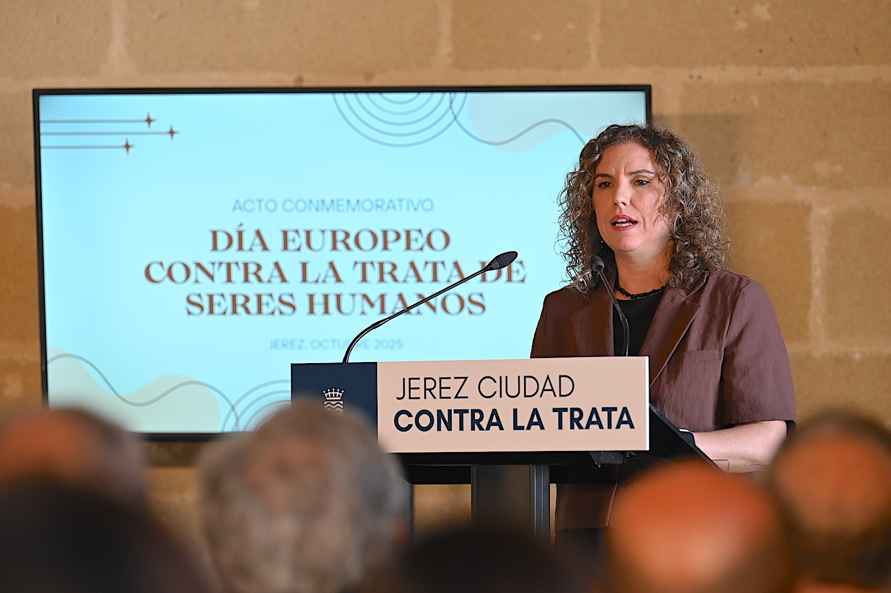 La teniente de alcaldesa de Igualdad y Diversidad, Susana Sánchez, ha presidido el acto conmemorativo del Día Europeo contra la Trata de Seres Humanos, que se ha celebrado en el Cabildo Antiguo en el marco de las actividades coordinadas por el Foro Social contra la Trata de Mujeres y Niñas con Fines de Explotación Sexual de Jerez de la Frontera.