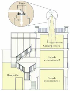 Está ubicada en la parte superior de la torre del palacio, y su funcionamiento es parecido al de una cámara fotográfica. Dentro de una sala (que tiene que estar completamente oscura y pintada de negro) hay una pantalla cóncava entorno a la cual se ubican los visitantes. En la azotea de la torre está instalado el sistema óptico, compuesto de un espejo y un par de lentes de gran precisión. Cuando se abre el espejo, la luz del sol entra por la ventana, pasa a través de las lentes y se refleja sobre la pantalla. Junto con la luz del sol se reflejan imágenes en vivo y a tiempo real de todo lo que hay y sucede en el exterior. Como además el espejo gira sobre sí mismo, durante la visita, haremos un giro de 360º entorno a la ciudad.
