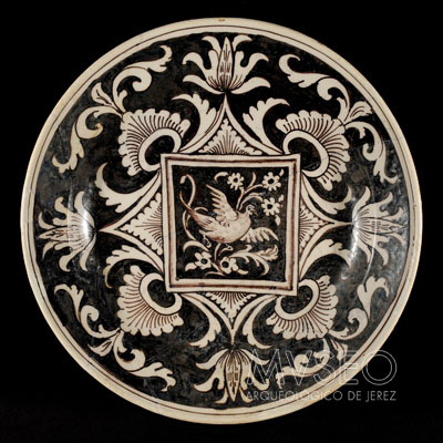 Fuente decorada en manganeso sobre fondo blanco creando motivos en reserva. El emblema central representa un ave entre ramos de flores, enmarcado en un cuadrado. De sus lados y de los cuatro ángulos surgen florones, estos últimos rematados por dobles hojas de acanto. El reverso se cubre con un espeso vidriado blanco. La pieza posiblemente fue fabricada en los alfares de Sevilla. En esta centuria los pintores de loza sevillanos supieron amalgamar todos los esquemas compositivos de las cerámicas y porcelanas que, procedentes de Génova, Holanda y de Japón, llenaban los mercados nacionales. De esta manera consiguieron realizar un producto de gran calidad técnica, con unas características particulares en nada parecidas a los modelos originales.