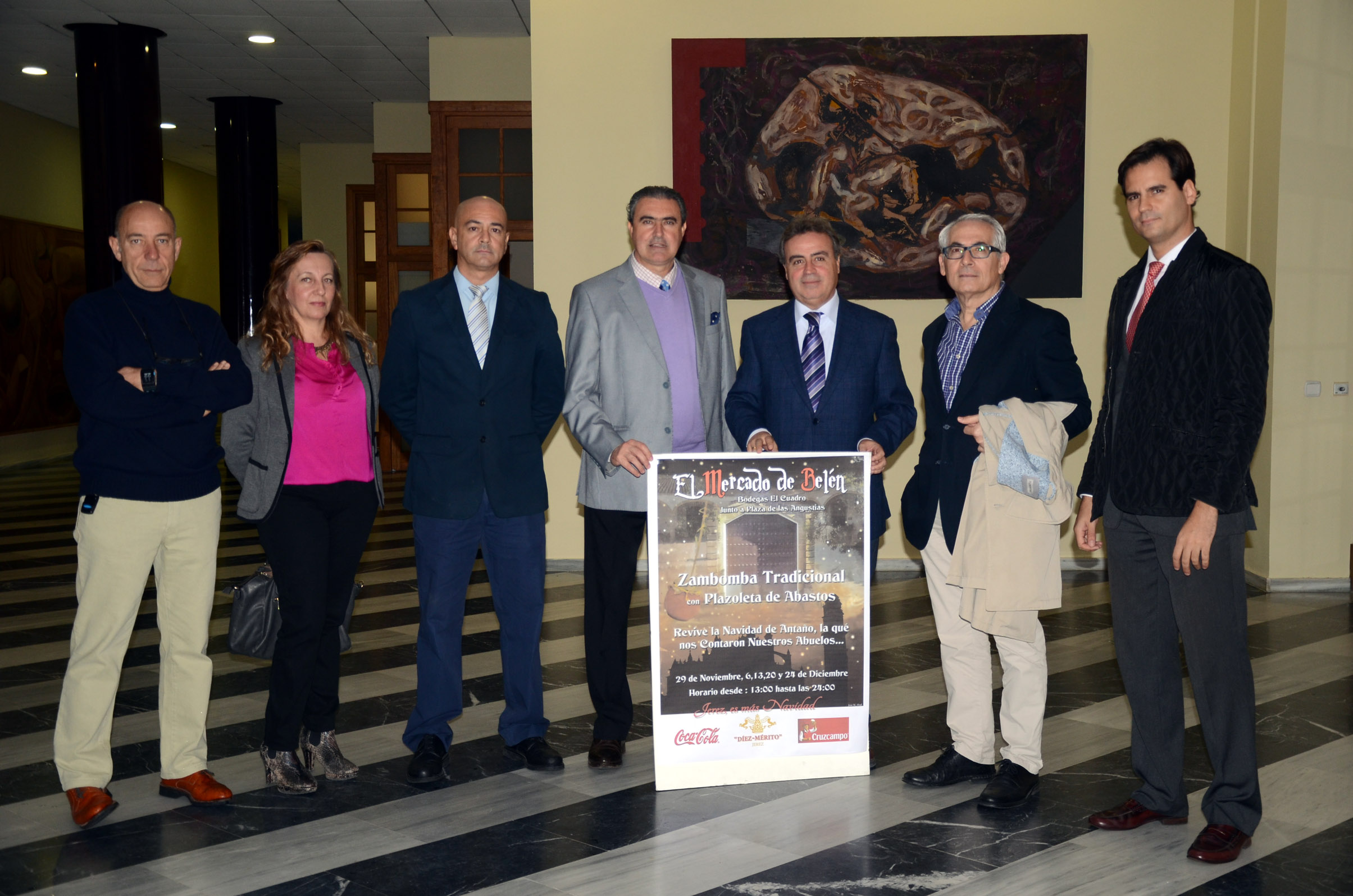 El delegado de Turismo, Cultura y Fiestas, Antonio Real, ha presentado hoy “El Mercado de Belén, Zambomba Tradicional”, acompañado de los promotores de esta iniciativa, Manuel Cobos y Jesús Cobos, de Gourmet Cobos Catering; Javier Muñoz, del restaurante la Carboná; Inmaculada Olmedo, de Viveros Olmedo; Nicolás Montilla, Director de Bodegas Diez Mérito y José Ángel Jiménez, de Coca Cola. Esta actividad, con entrada gratuita, se celebrará todos los sábados desde el día 29 hasta el 24 de diciembre en las Bodegas El Cuadro, junto a la plaza de las Angustias.
