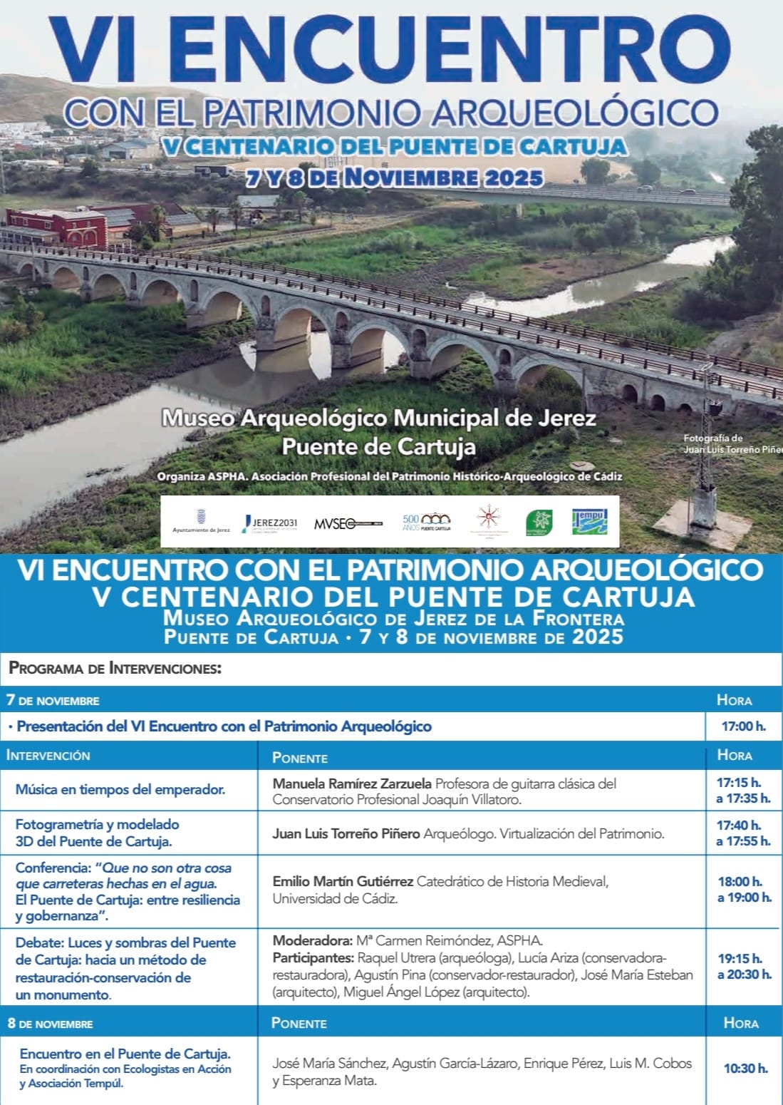 Por su parte, la presidenta de ASPHA, Carmen Reimóndez, destacó que estos encuentros “nacieron con la vocación de acercar la arqueología a toda la ciudadanía” y que, aunque contará con especialistas, “las sesiones están pensadas para un público general, con un lenguaje claro y accesible”. Explicó que el programa incluirá reconstrucciones 3D del puente, música, conferencias y una mesa de debate final sobre la conservación y restauración del patrimonio. “El Puente de Cartuja será nuestro hilo conductor para reflexionar sobre cómo protegemos y mejoramos los bienes históricos de Jerez”.