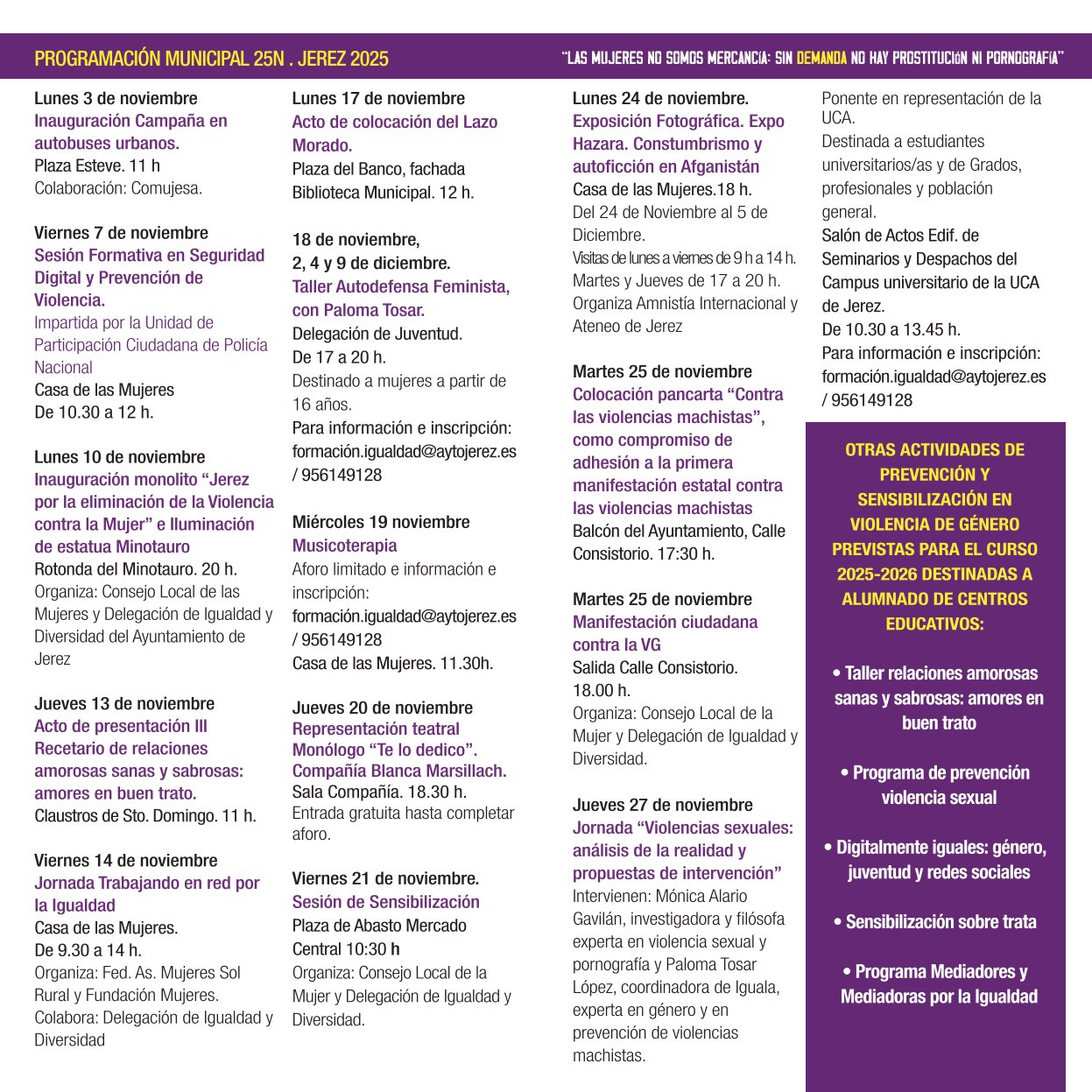 La programación conmemorativa del 25 N se extenderá durante todo el mes de noviembre. Tiene como novedad la iluminación morada del Minotauro, en cuya rotonda se instalará un monolito para que durante todo el año se convierta en un emblema contra la violencia machista, y que se inaugurará el 10 de noviembre. El ciclo de actividades comenzará el lunes 3 de noviembre con la inauguración de la campaña en los Autobuses Urbanos, que llevarán su mensaje de sensibilización a todos los rincones de Jerez.