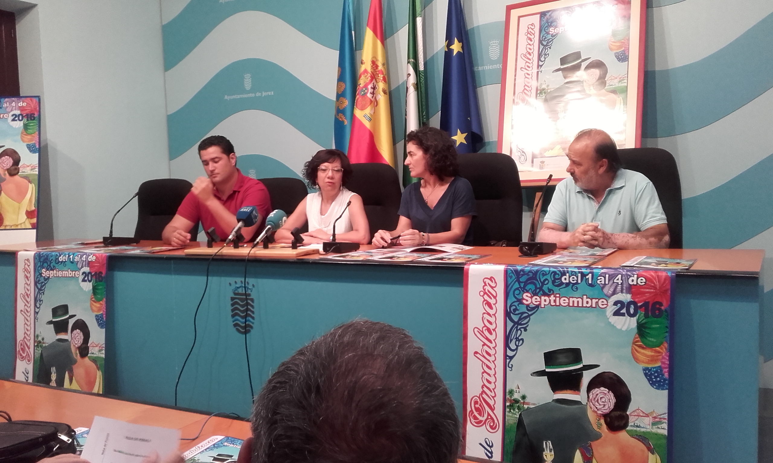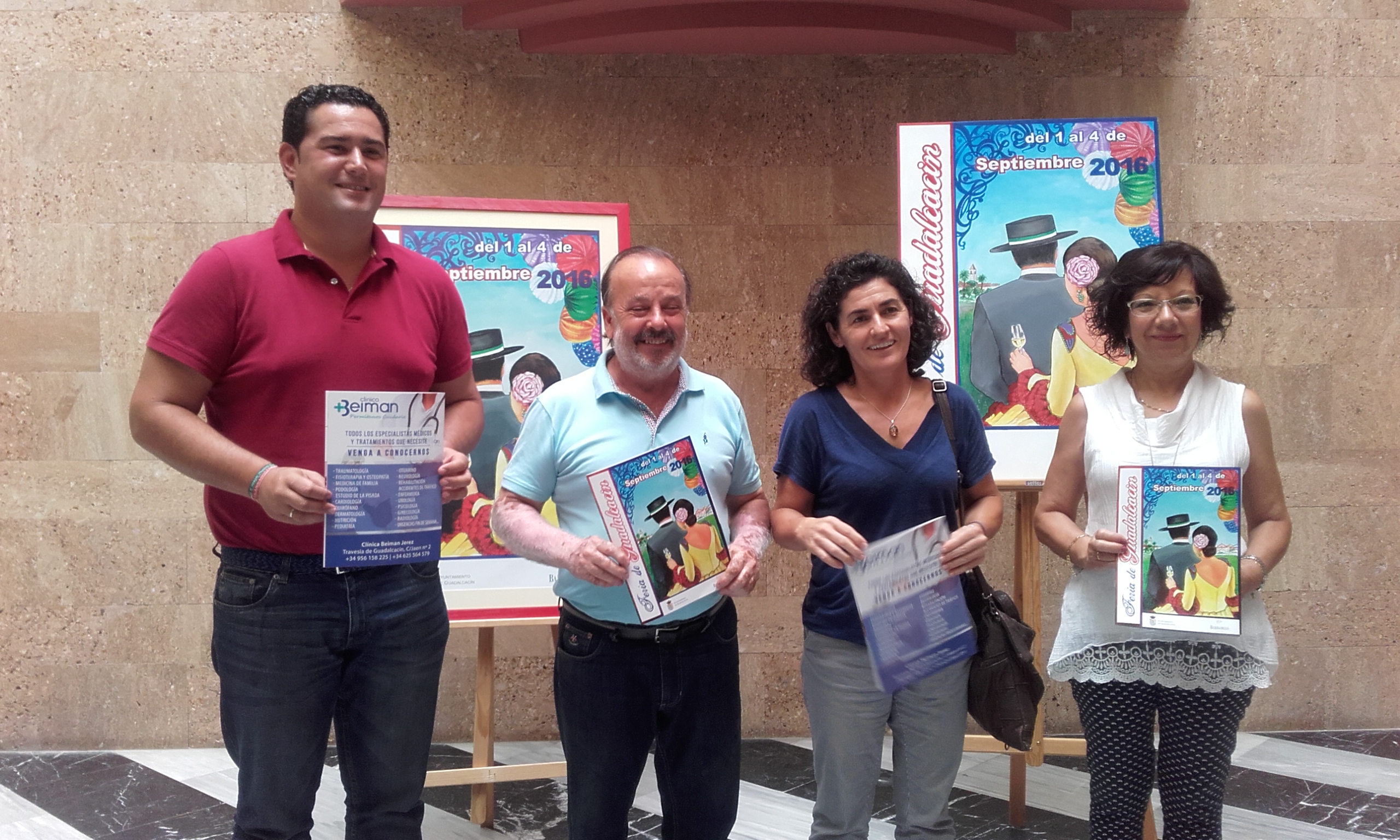 La teniente de alcaldesa de Igualdad, Acción Social, y Medio Rural, Carmen Collado, junto a la alcaldesa de Guadalcacín, Nieves Mendoza, y su delegado de Fiestas, Salvador Ruiz, ha presentado hoy la Feria de Guadalcacín 2016, que se celebrará del 1 al 4 de septiembre. La presentación ha contado con la presencia de José María Valderas, autor del cartel.