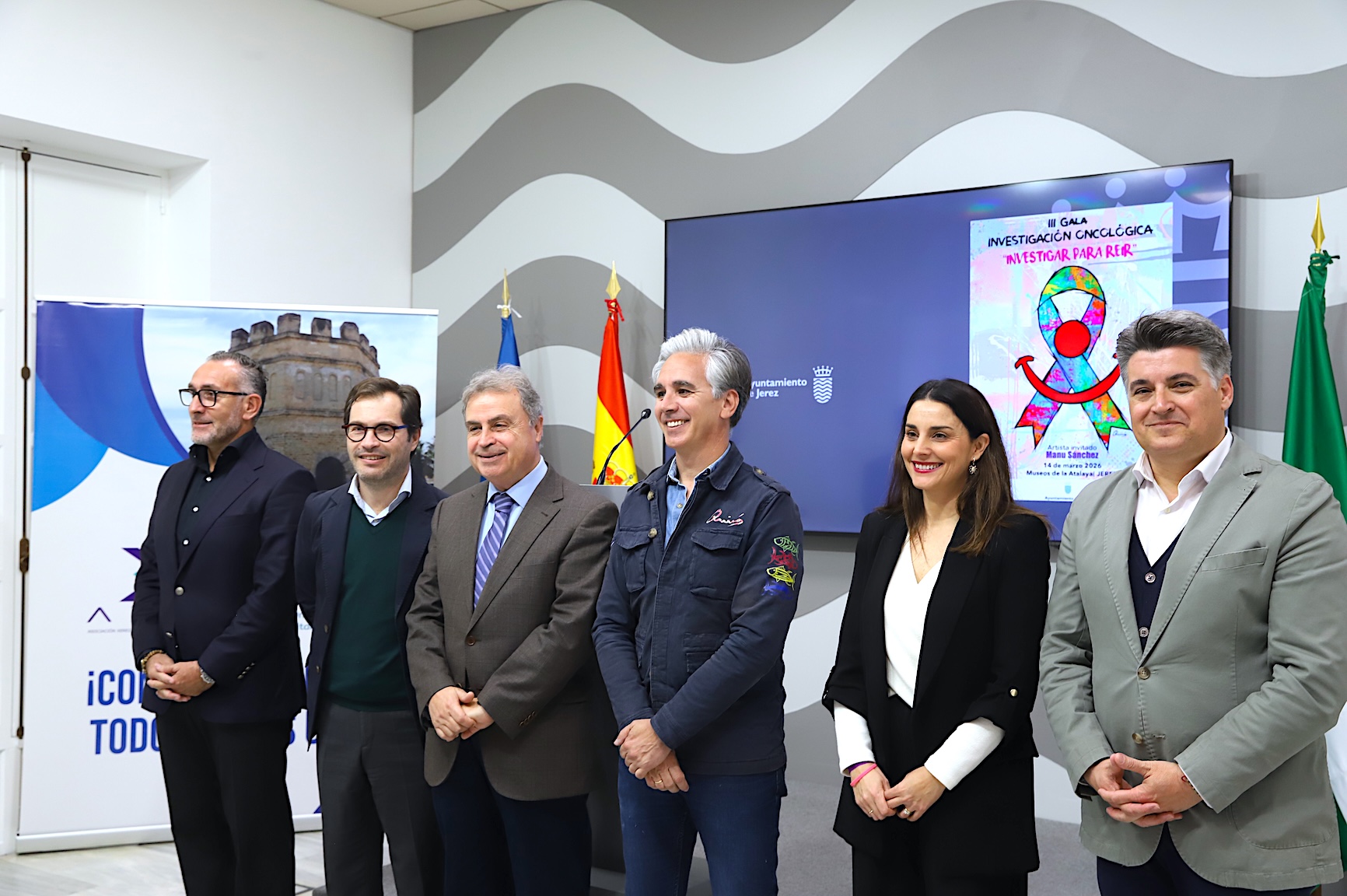 El  teniente de alcaldesa y delegado de Turismo, Antonio Real, junto al delegado de Deportes y Salud, Tomás Sampalo, el doctor Jesús Corral Jaime, presidente de la Asociación Xerezana de Investigación Oncológia (AXIO), el pintor Fernando Quirós (autor del cartel), ha presentado la III Gala AXIO que, bajo el lema ‘Investigar para Reír’, se desarrollará el 14 de marzo, a partir de las 13:00 horas, en los Museos de la Atalaya.