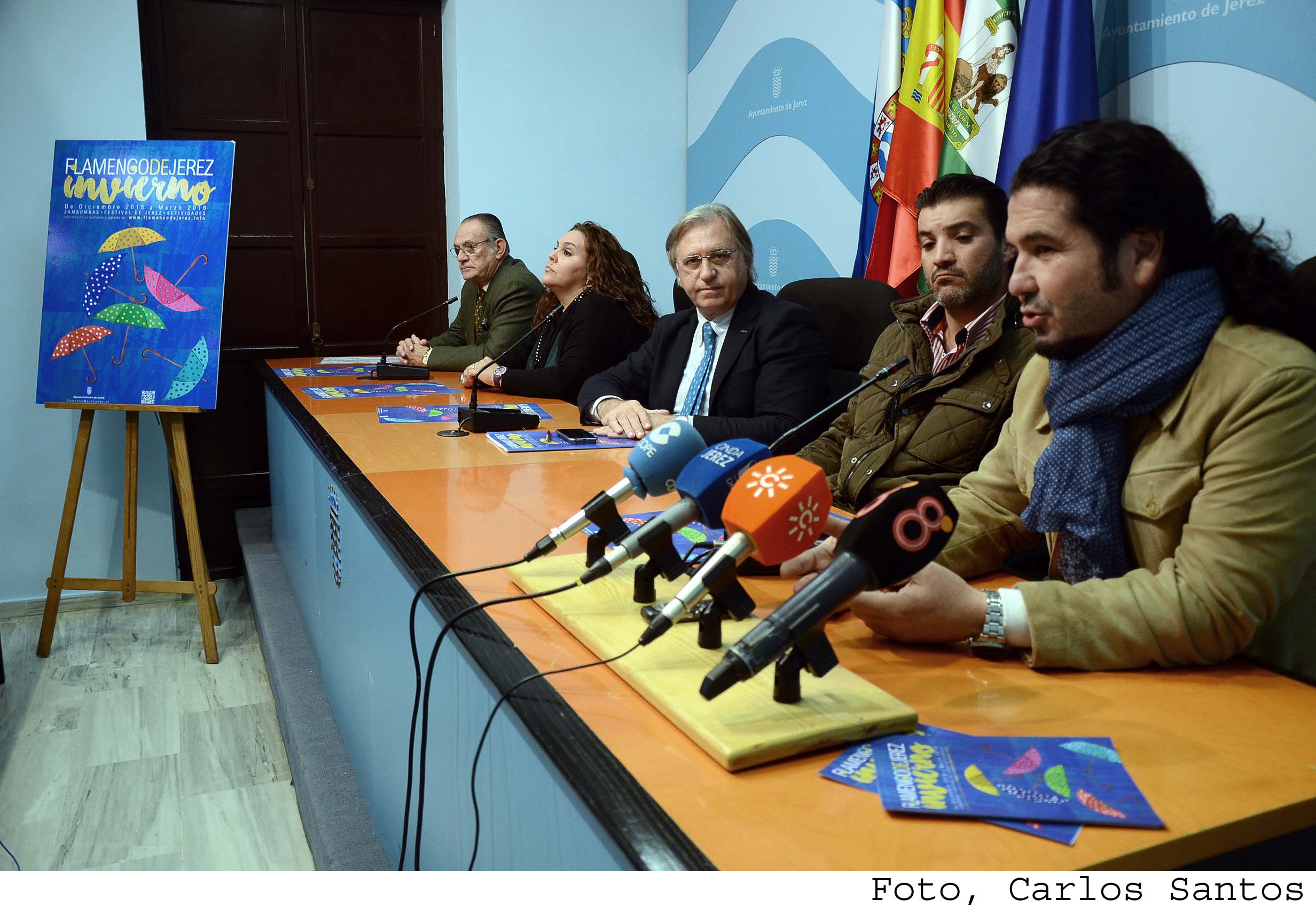 El teniente de alcaldesa de Urbanismo, Dinamización Cultural, Patrimonio y Seguridad, Francisco Camas, acompañado por los cantaores Ana de los Reyes y Juan Lara, el presidente de la Federación Local de Peñas Flamencas de Jerez, Manuel Moreno y Mario González, del establecimiento La Guarida del Ángel, ha presentado hoy el ciclo ‘Flamenco de Jerez. Invierno 2015-2016’, que se desarrollará hasta el próximo mes de marzo.