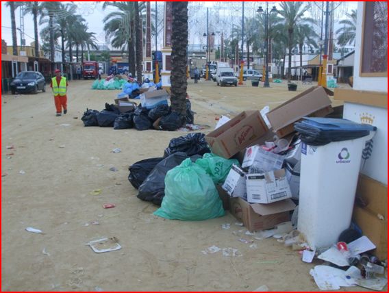 El servicio montado por Medio Ambiente y Ajemsa ha cubierto la zona de los "cacharritos" y los aledaños del recinto; es decir: Avenida Álvaro Domecq, Paseo de la Rosaleda, Comandante Paz Varela, el “Cuco”, Avenida del Ejercito, Paseo de Sementales, Avenida de la Feria, Calles Pablo Neruda y Rafael Alberti, etc., que han sido barridos y baldeados diariamente. Asimismo, han ocupado de limpiar la zona de acampada de feriantes, así como los alrededores de la plaza de toros que han sido limpiados y baldeados los días de celebración de la feria taurina. También han sido cubiertas las necesidades del depósito de sementales durante la celebración de las pruebas hípicas.