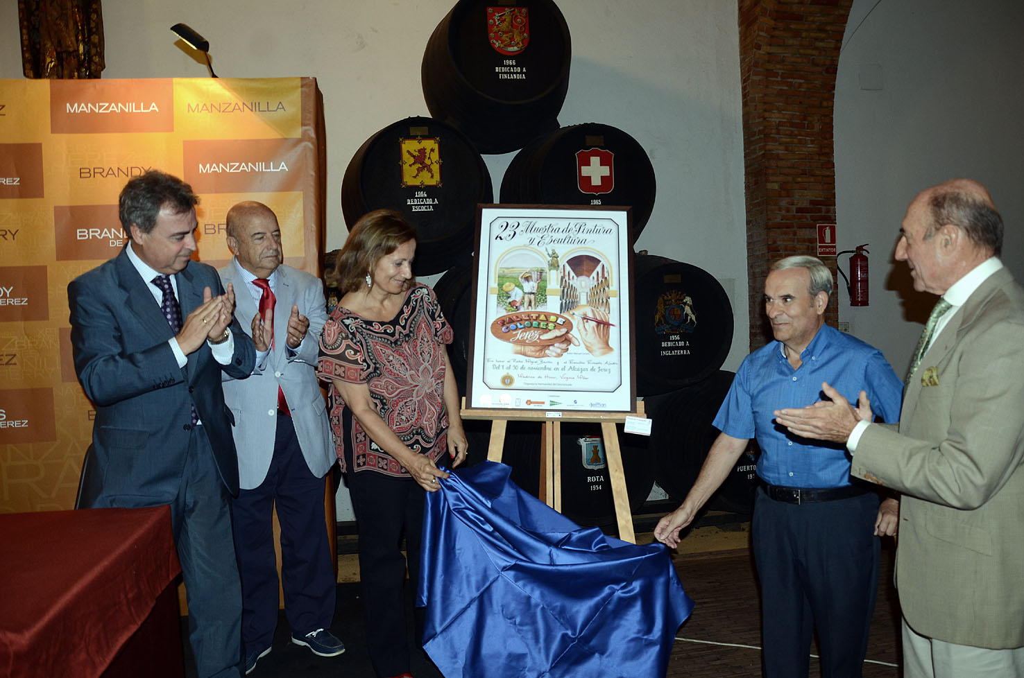 El delegado de Turismo, Cultura y Fiestas, Antonio Real, acompañado por el presidente del Consejo Regulador, Beltrán Domecq, Ignacio Soto, en representación de la Hermandad del Desconsuelo y otros miembros de la comisión organizadora de la muestra de pintura y escultura ‘Jerez Paleta de Colores’, ha asistido hoy, en el Consejo Regulador, a la presentación del cartel de la XXIII edición de la exposición, obra del jerezano Manuel Cervera.
