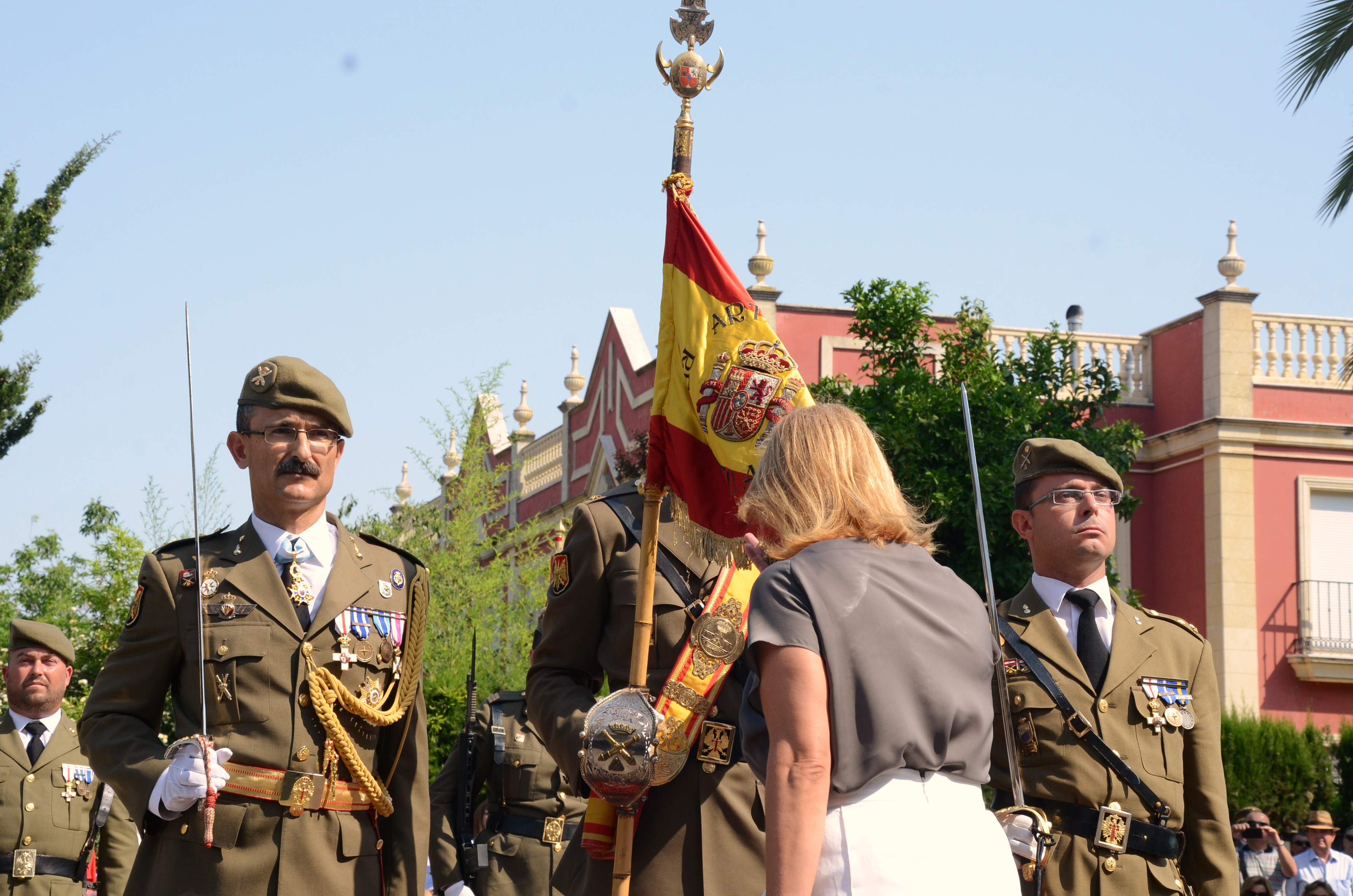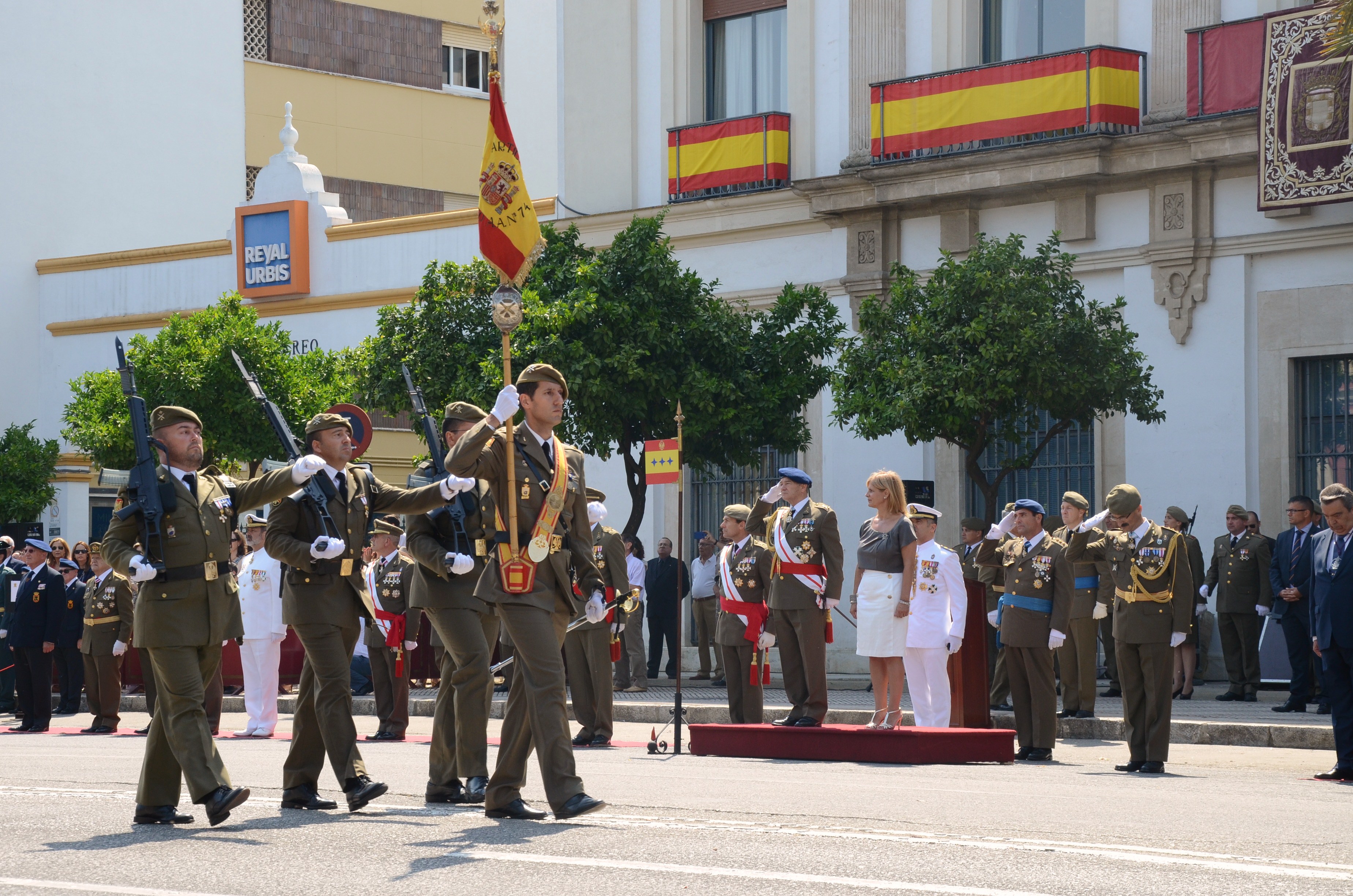 La alcaldesa, María José García-Pelayo, y el Jefe del Cuarto Militar de la Casa de S. M. el Rey, el Teniente General Antonio de la Corte García, y en presencia de miembros del Gobierno municipal, ha presidido hoy domingo los actos conmemorativos del 75 aniversario de la creación, en Jerez, del Regimiento de Artillería nº 74. Asimismo, alcaldesa ha firmado en el Libro de Honor del Regimiento de Artillería nº 74. El Jefe del Cuarto Militar de la Casa de S. M. el Rey, el Teniente General Antonio de la Corte García, ha hecho entrega a la alcaldesa de una reproducción del guión del Regimiento de Artillería nº 74, como obsequio por la colaboración del Ayuntamiento en este acto conmemorativo. Dicho guión, que lleva los colores tradicionales de Artillería y el escudo del Regimiento, es el que marca el sitio en el que se encuentra el jefe del Regimiento. El acto de entrega ha tenido lugar en el Consejo Regulador.