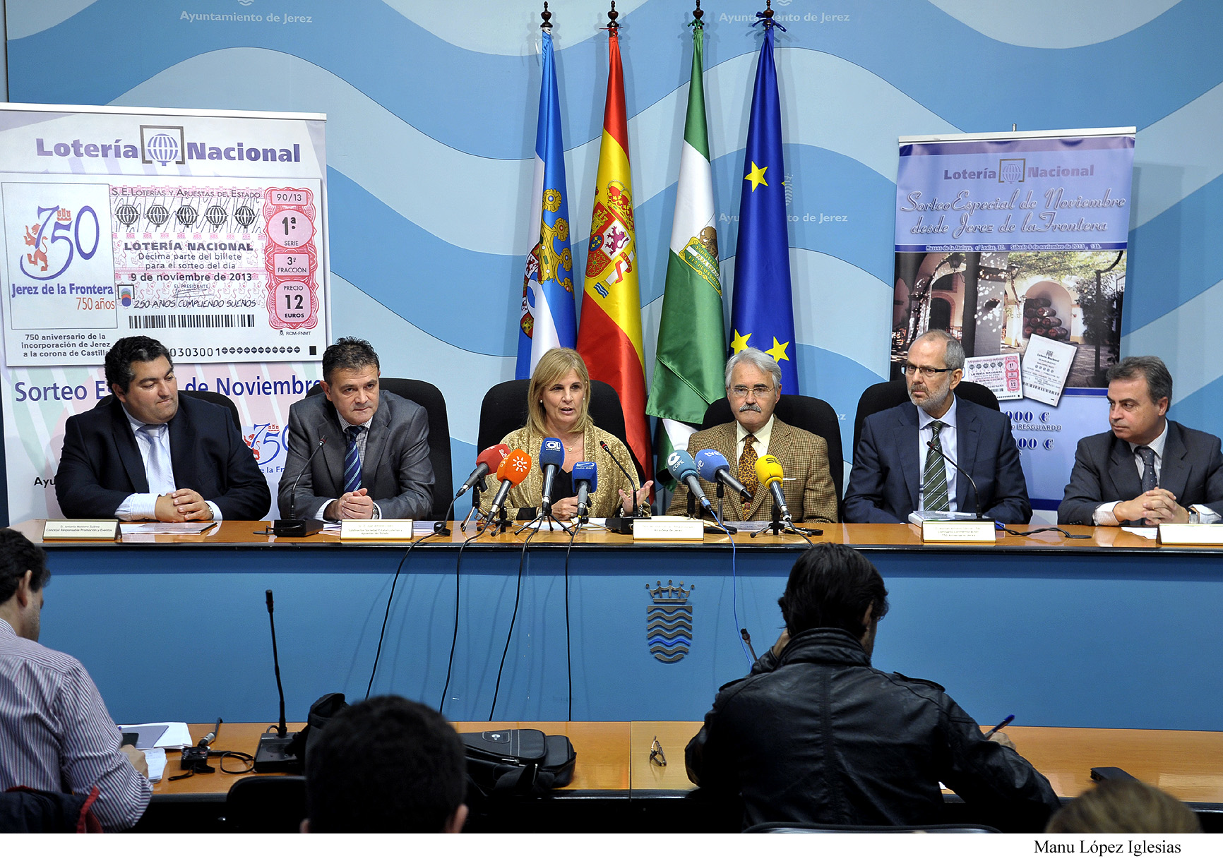 La alcaldesa, María José García-Pelayo, y el subdirector de Juegos de Loterías y Apuestas del Estado, Juan Antonio López, han presentado los detalles del Sorteo Especial de Noviembre de la Lotería Nacional que se celebrará este sábado, 9 de noviembre, en La Atalaya, con motivo de la celebración del 750 aniversario de Jerez. En el acto han estado también el delegado de Turismo, Cultura y Fiestas, Antonio Real, el concejal responsable del Plan Especial de Promociones Culturales, Antonio Montero, el delegado del Ministerio de Economía y Hacienda en Cádiz, Miguel Gómez Martín, y el Comisario del 750 aniversario, Manuel Antonio García-Paz.