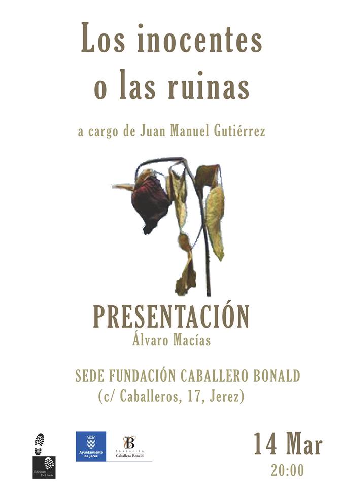 La Fundación Caballero Bonald presenta el próximo lunes 14 de marzo, a las 20 horas, el primer libro del poeta jerezano Álvaro Macías, que estará acompañado en su presentación por el autor Juan Manuel Gutiérrez. El libro, publicado por Ediciones en Huida, lleva por título 'Los inocentes o las ruinas'.